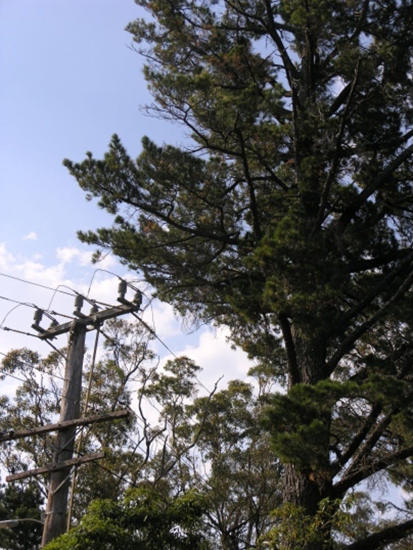 This 25m tall radiata pine standing beside and above these power lines is a typical example of how close large trees are next to power lines in the Blue Mountains. It stands 15m from my house on the neighbour’s side of the fence. An Endeavour Energy consultant informed me that power would have to be turned off in order to prune around this tree. This is a costly exercise involving the disconnection of electricity in the area, and therefore it would be very unlikely that the tree would be pruned. Fortunately for me my new neighbour has taken on the job of removing the tree at his own expense and with no collaboration from Endeavour Energy, however there are many examples of this kind in most streets and roads in the area and not everyone can afford such expense.